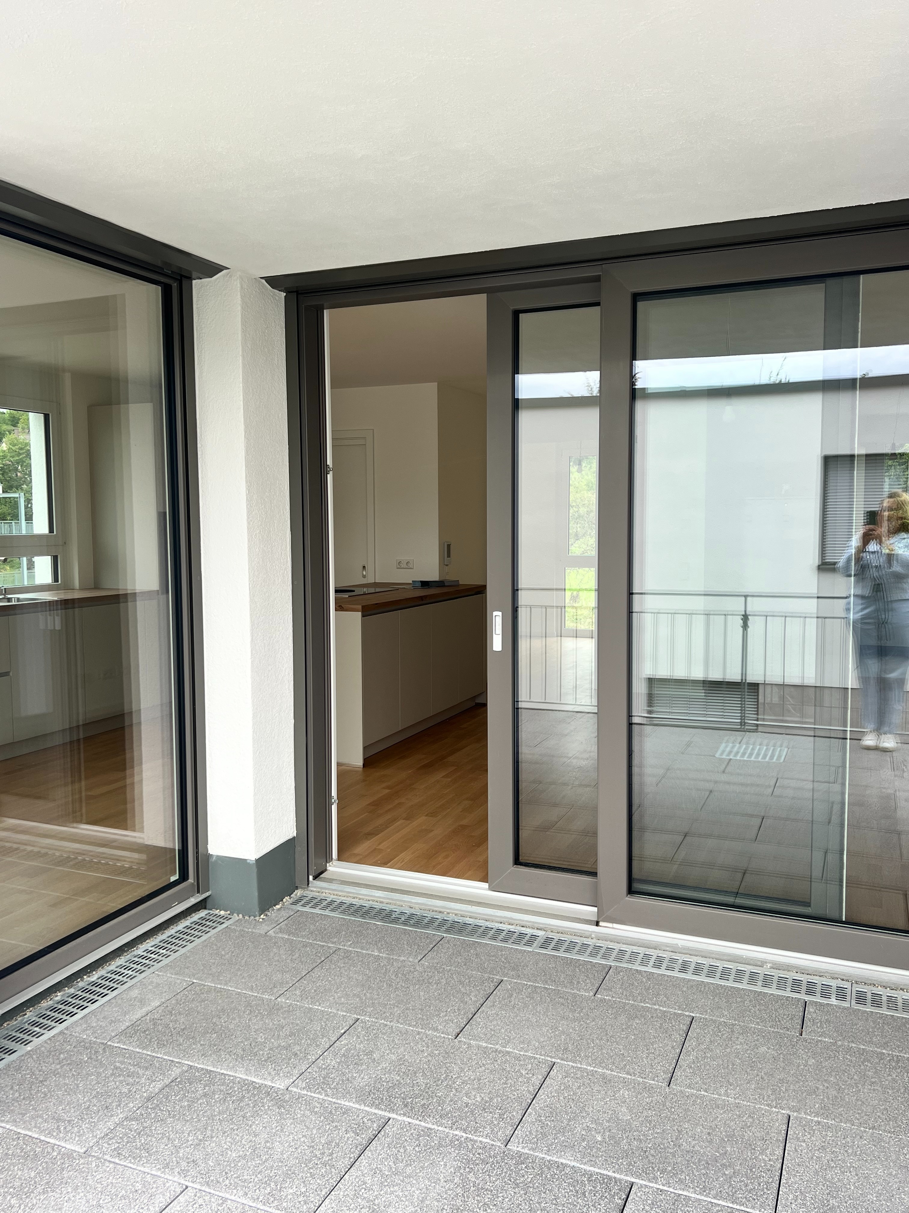 – großzügiger Wohn-/Essbereich mit viel Tageslicht durch große Glasfront mit Hebe-Schiebe-Element