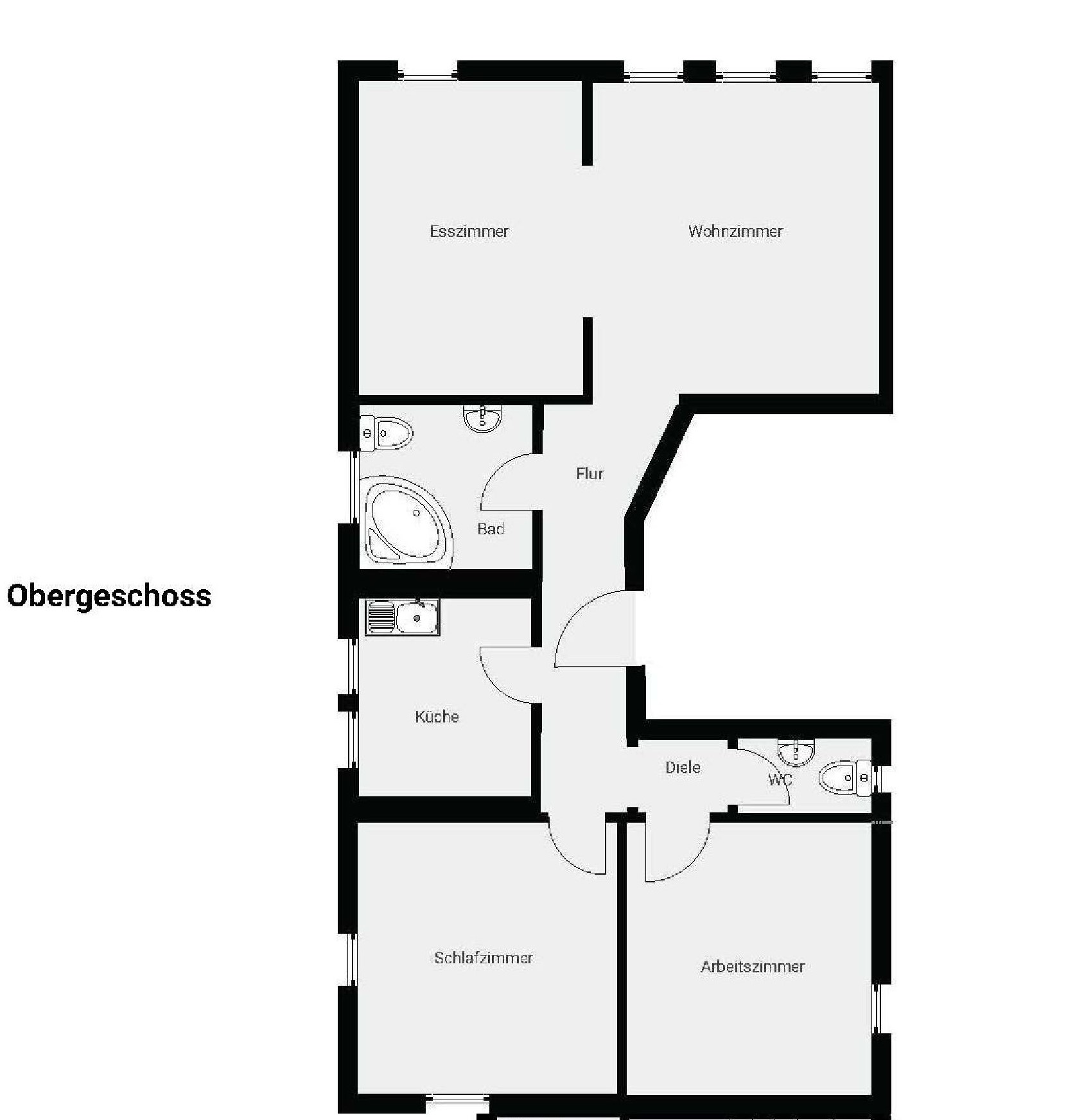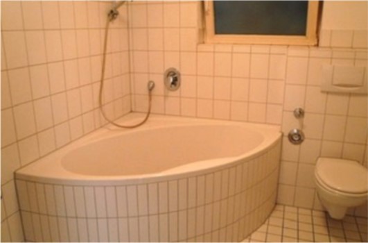 Vom Flur aus gelangt man zunächst in ein Badezimmer mit Tageslicht und einer Eckbadewanne sowie zur Küche, welche auch mit einem Fenster ausgestattet ist.