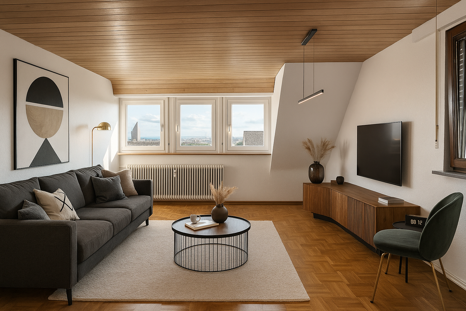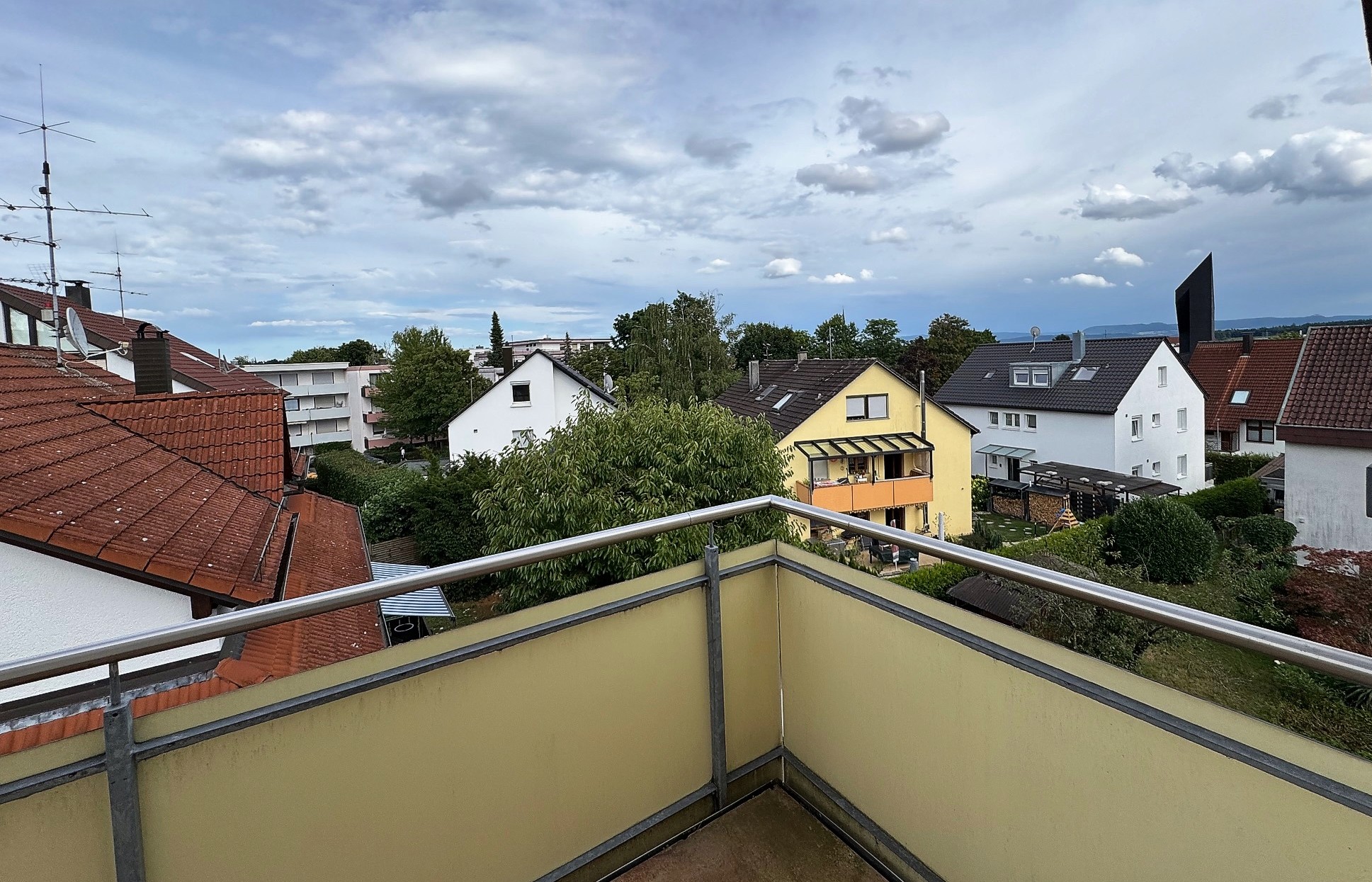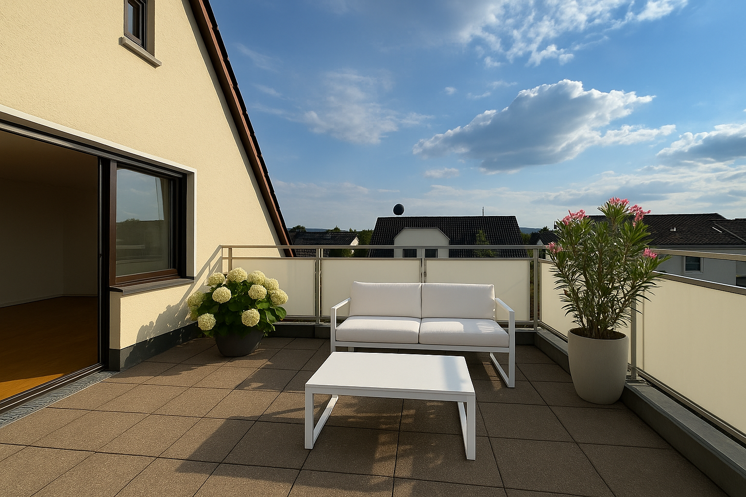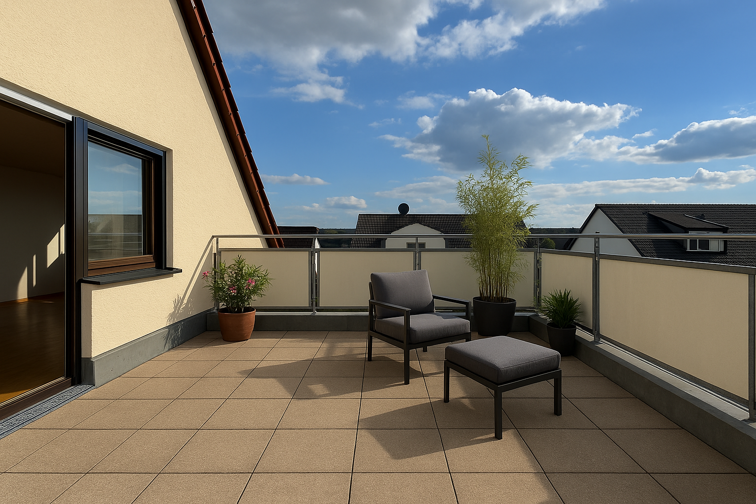 Die oberste Wohnung verfügt über eine beeindruckende Dachterrasse mit Blick auf die Schwäbische Alb. Hier können Sie Ihre Abende bei Sonnenuntergang und herrlichem Ausblick genießen.