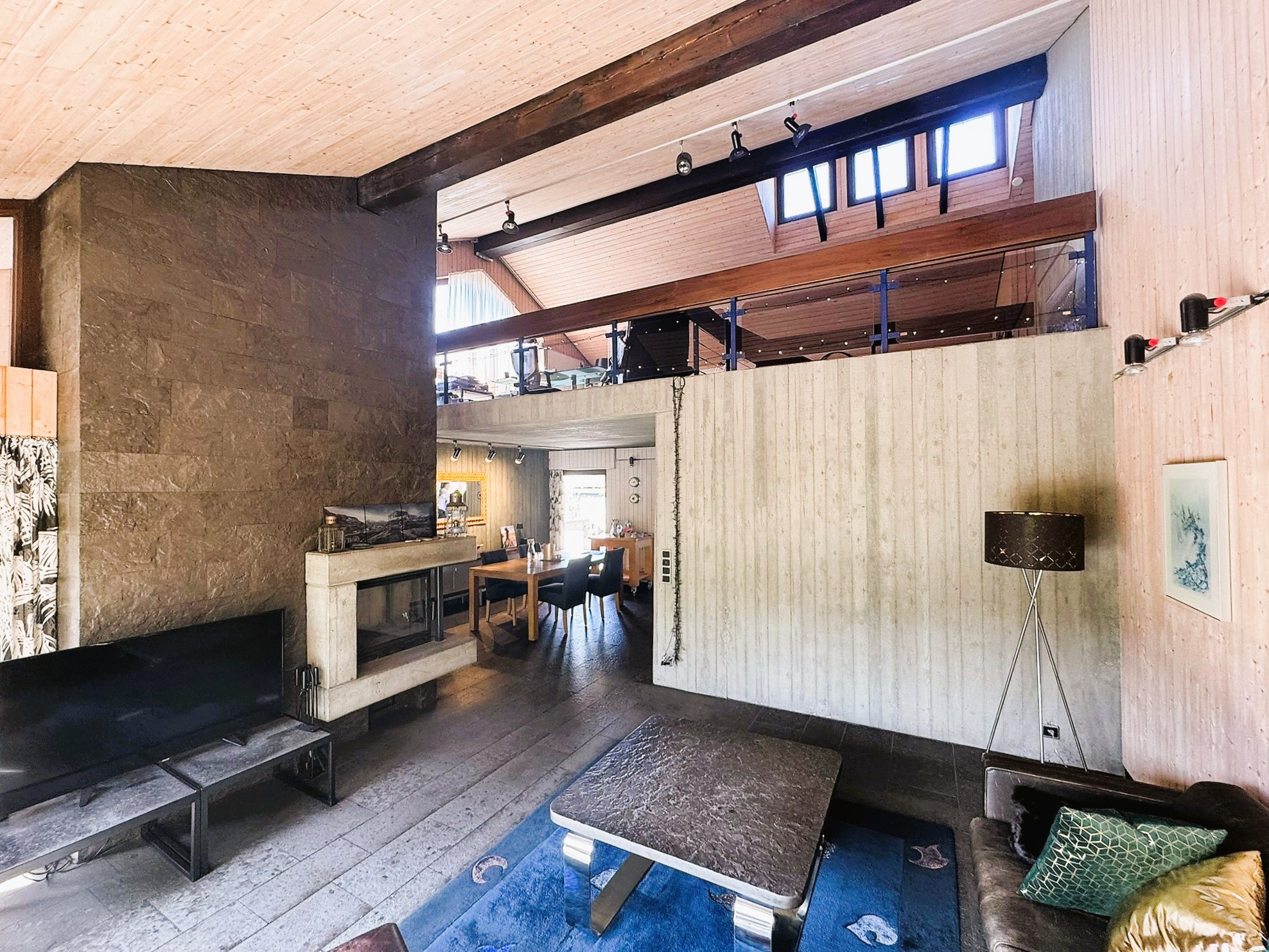 Das Herz des Hauses ist ein großer Wohn-Essbereich mit hohen Decken und Galerie.