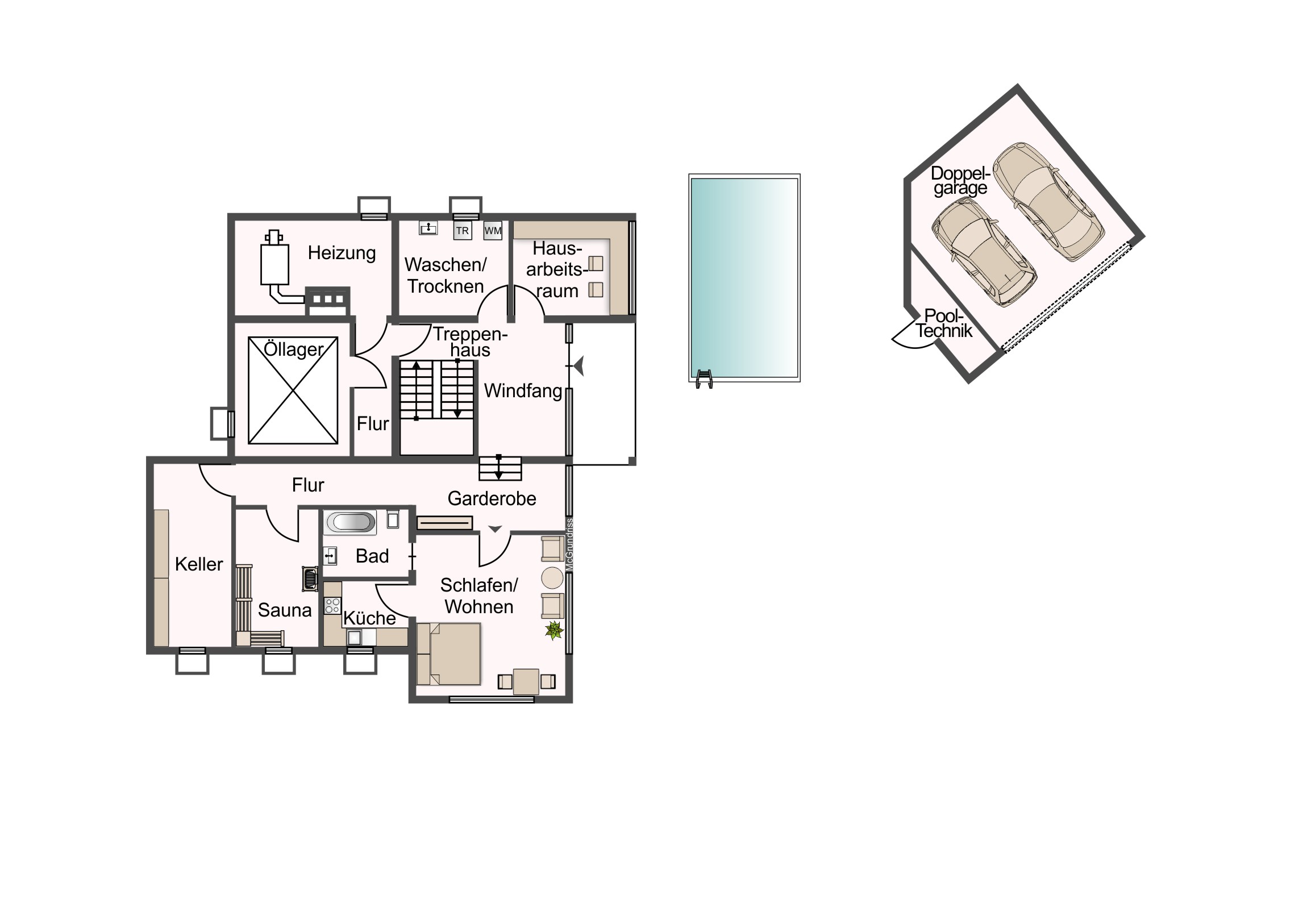 – Doppelgarage (für ein großes und ein kleines Auto) mit zwei Stellplätzen davor