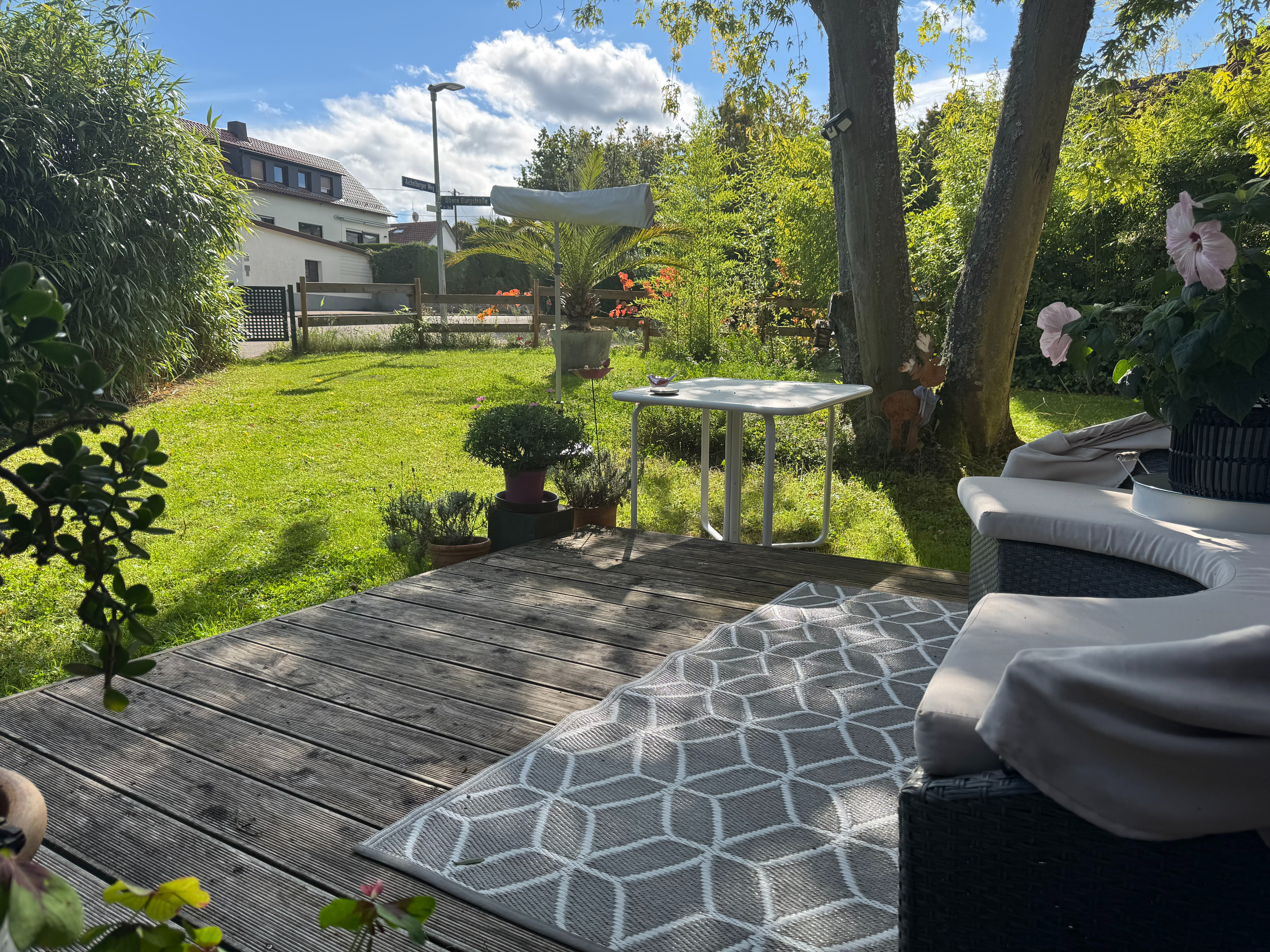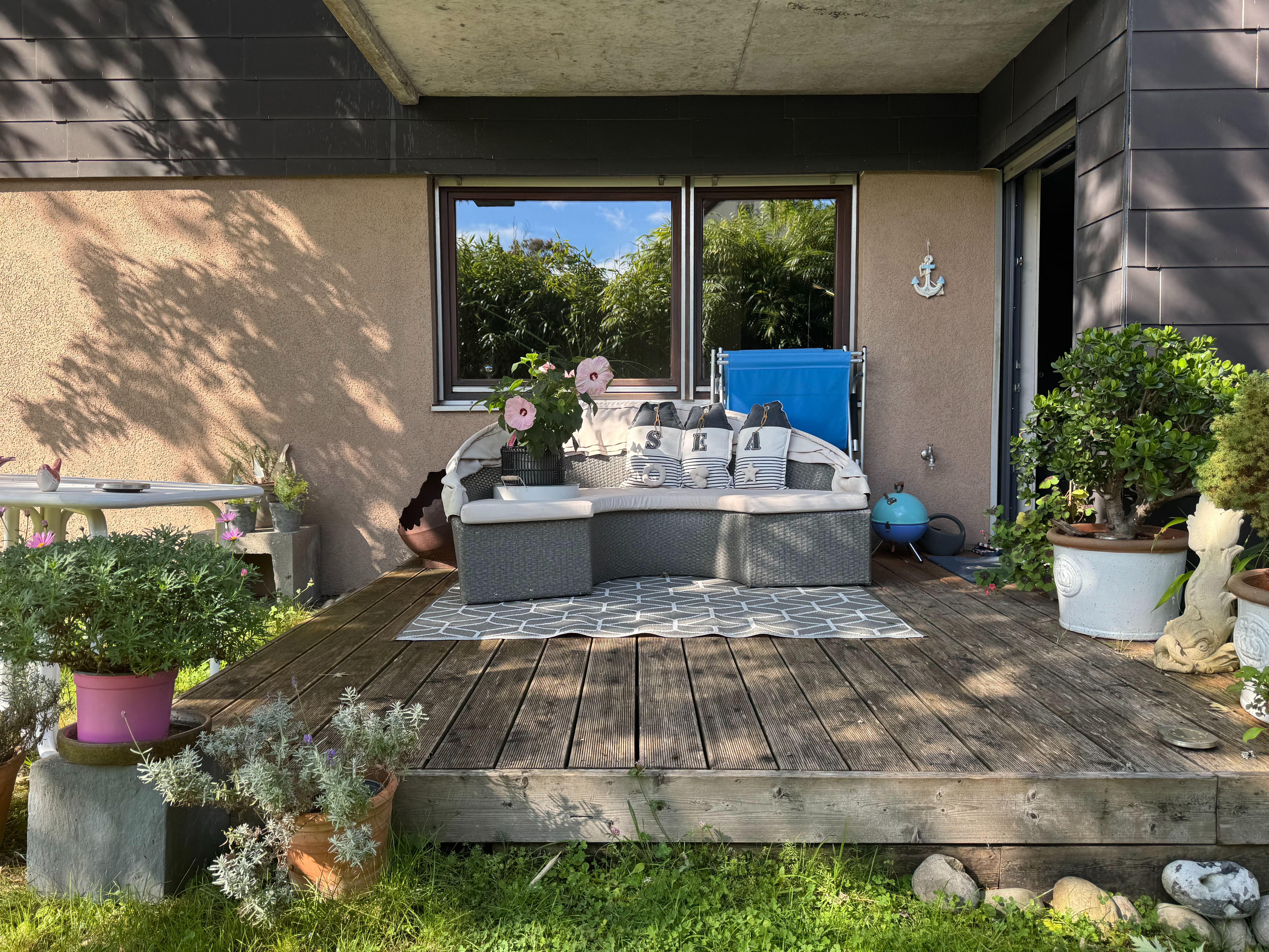 An den Wohnbereich schließt sich eine Art Patio mit Terrasse und kuscheligem Garten an. Dort können Sie sich völlig geschützt aufhalten.