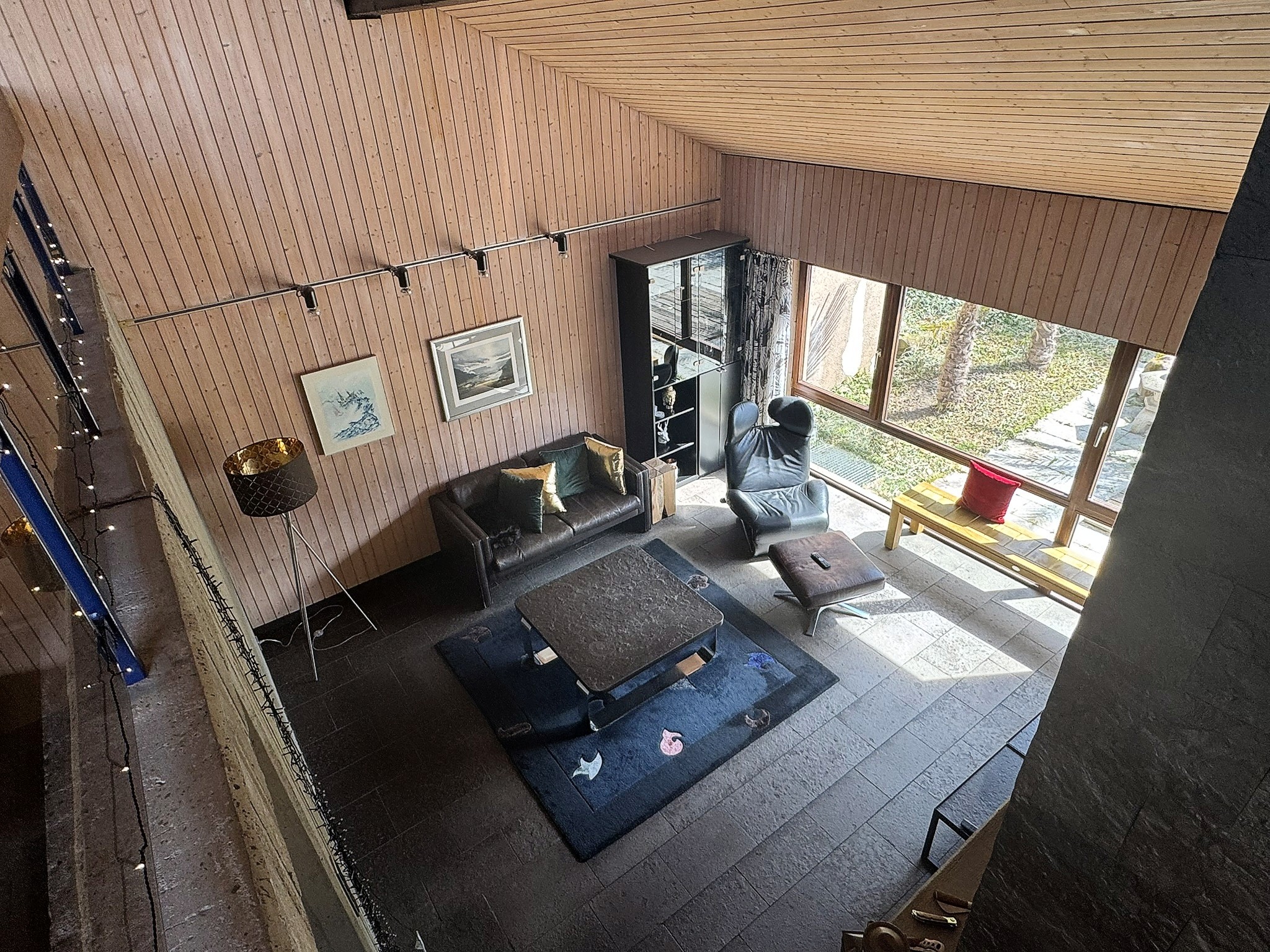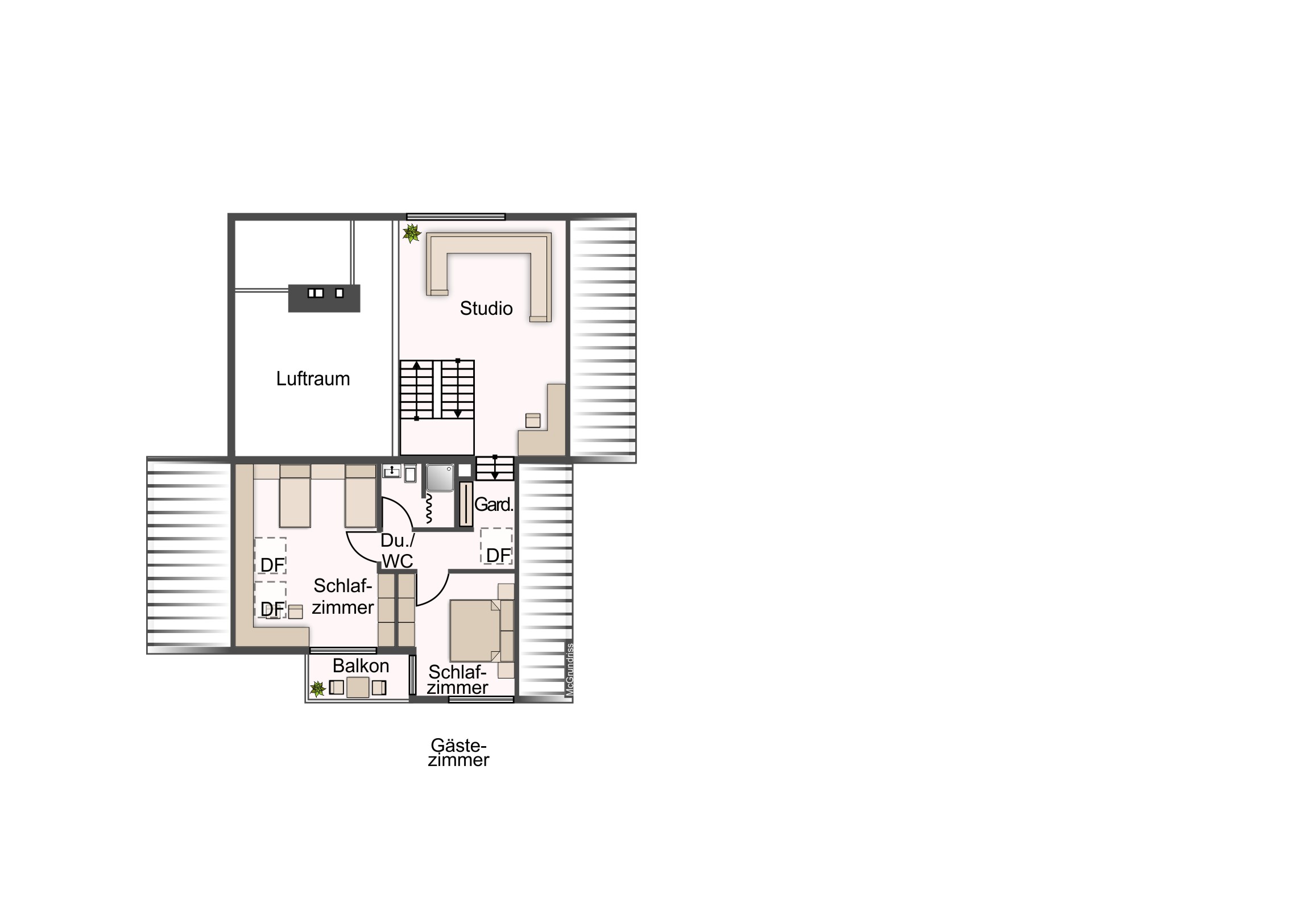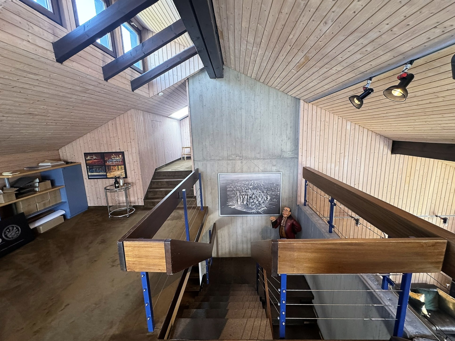 Der Schlaf- und Arbeitsbereich samt Bad befindet sich eine Ebene weiter oben, den Sie über die Galerie bequem erreichen können.