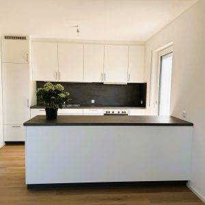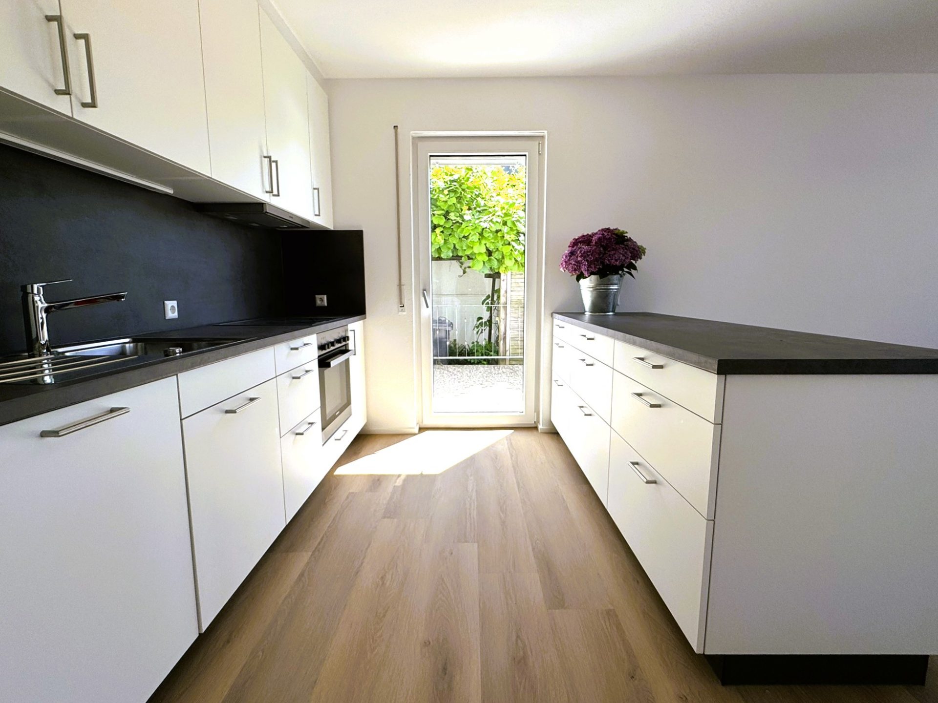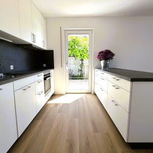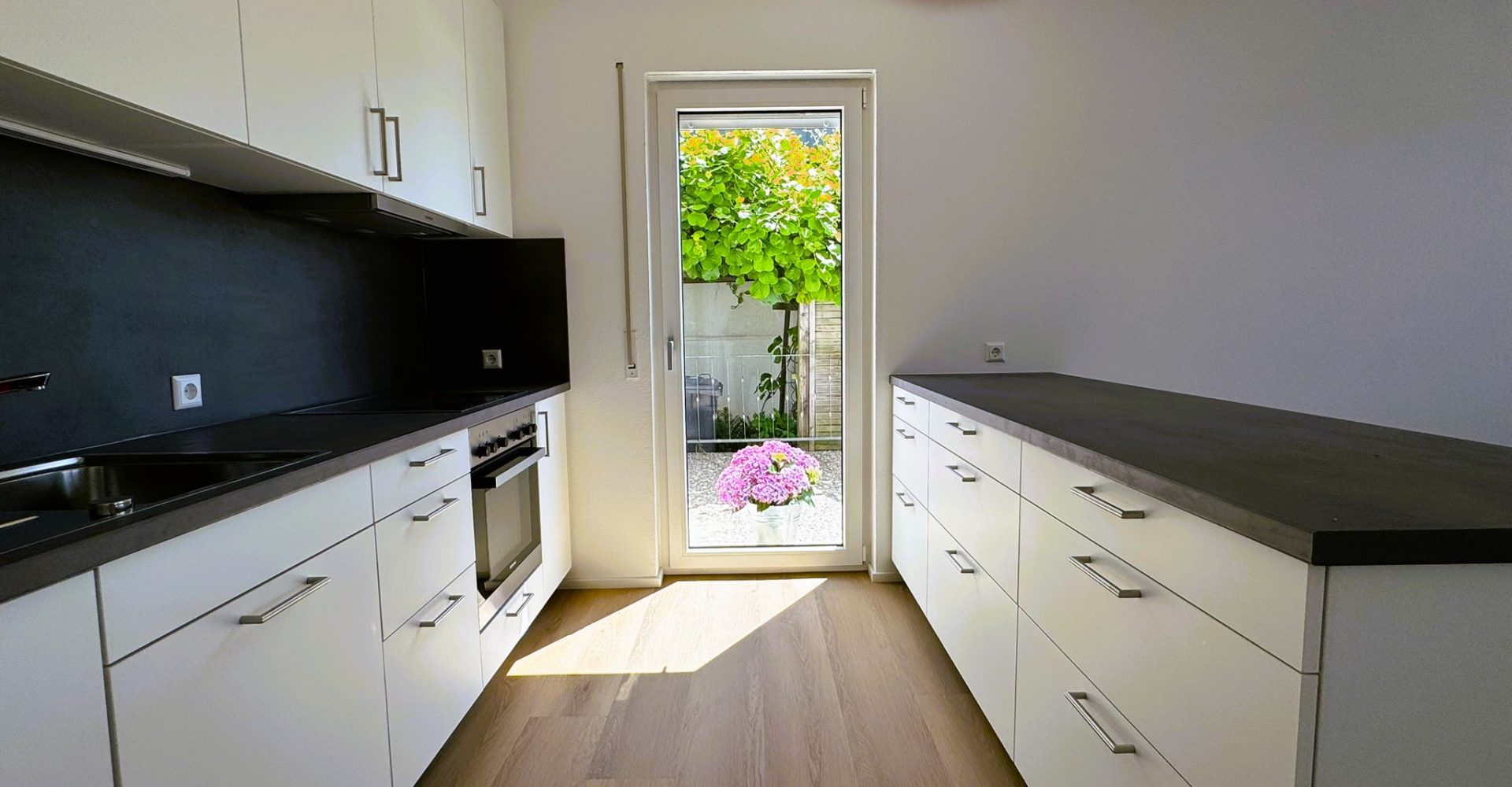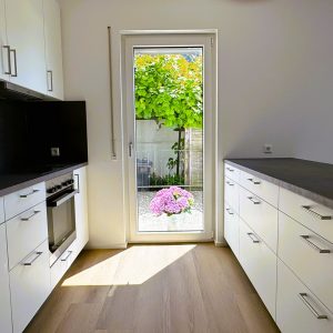 Eine vom Schreiner gefertigte, weiße Einbauküche steht bereit zum Kochen und Werkeln.