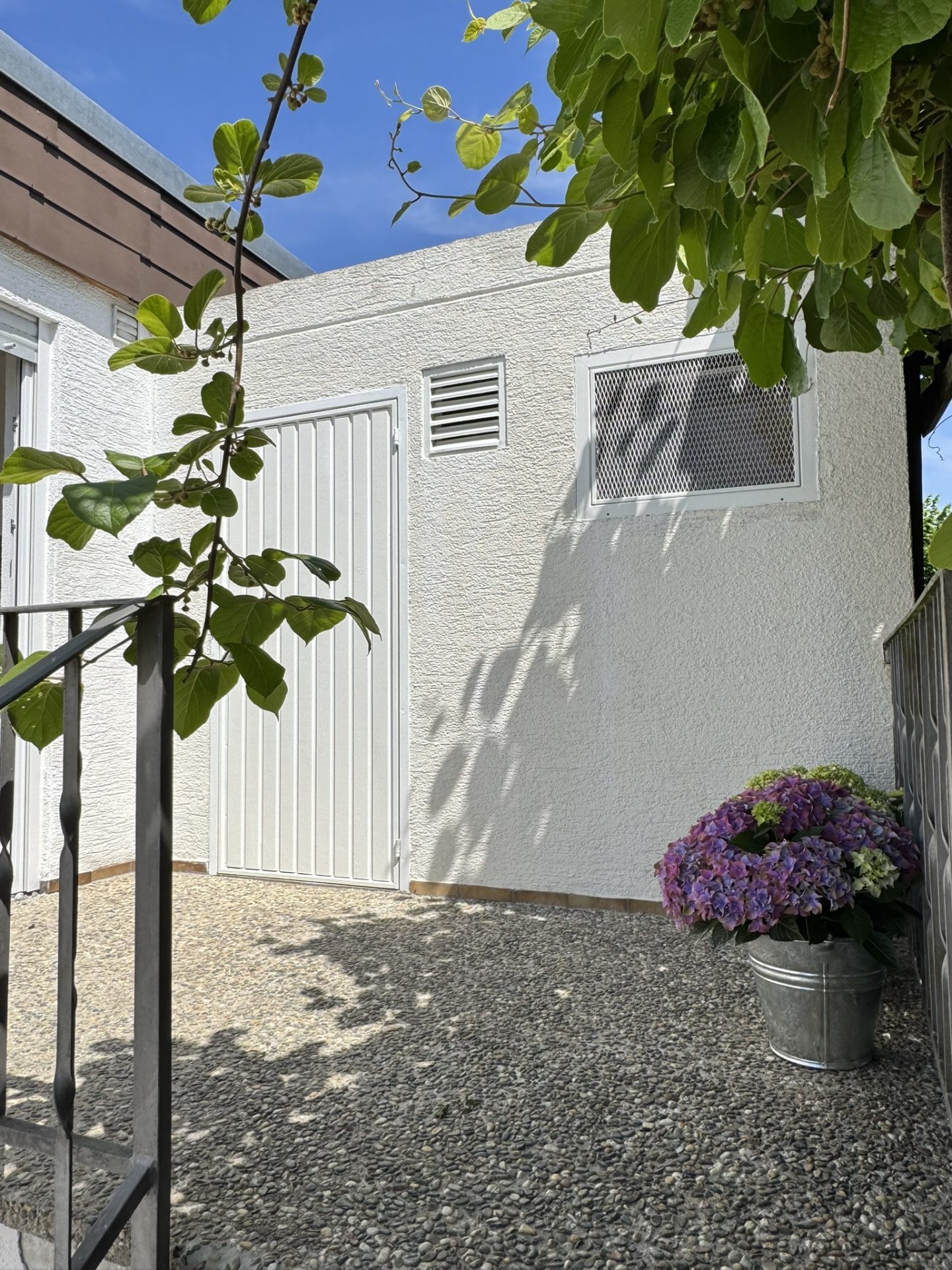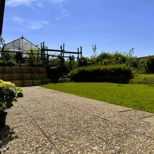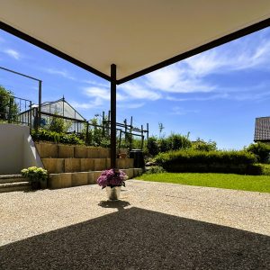 Die Garage liegt direkt neben dem Haus und hat einen Durchgang zur Küche und in den Garten.